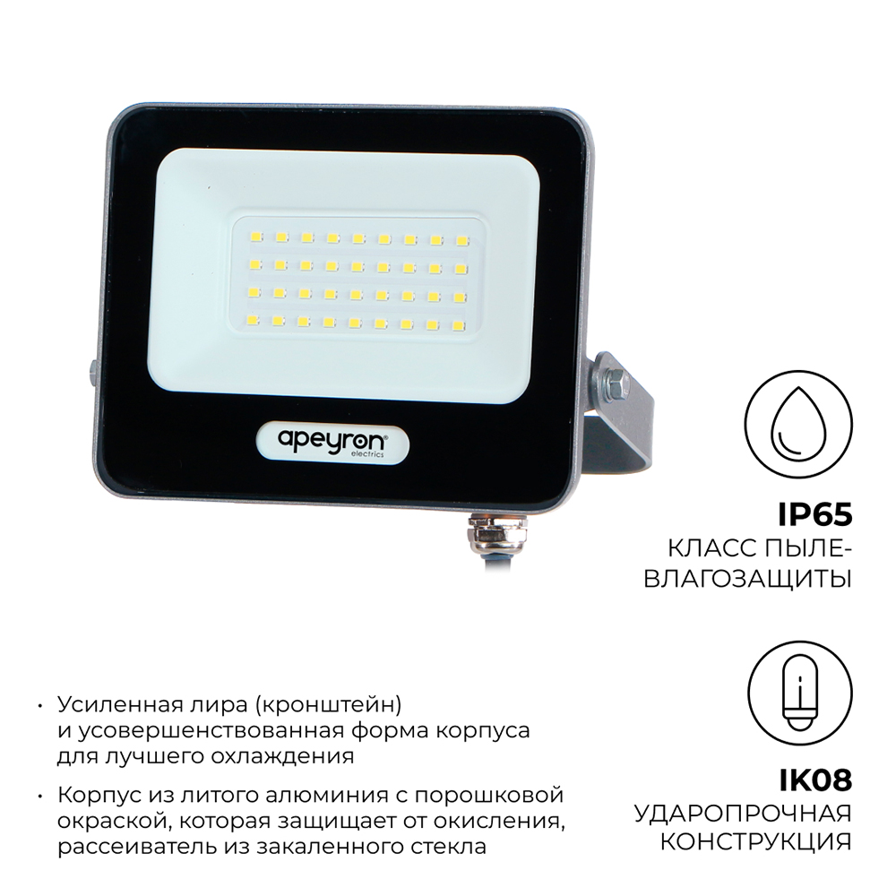 APEYRON Прожектор Серый (30W, 220V, 6500К, IP65)(С)
