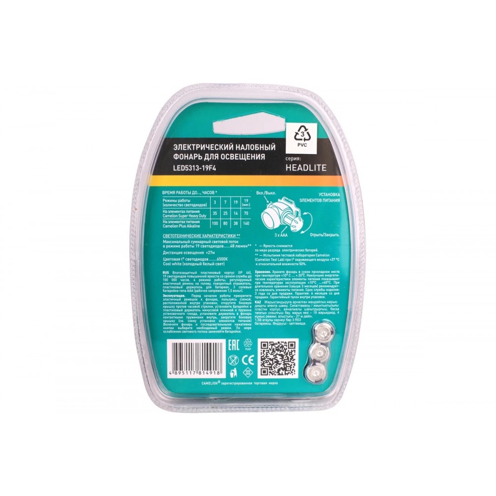 Технические характеристики Фонарь светодиодный налобный Металлик, 19LED, 3xR03 в комплекте, 4 режима, Пластик, LED5313-19F4 Camelion