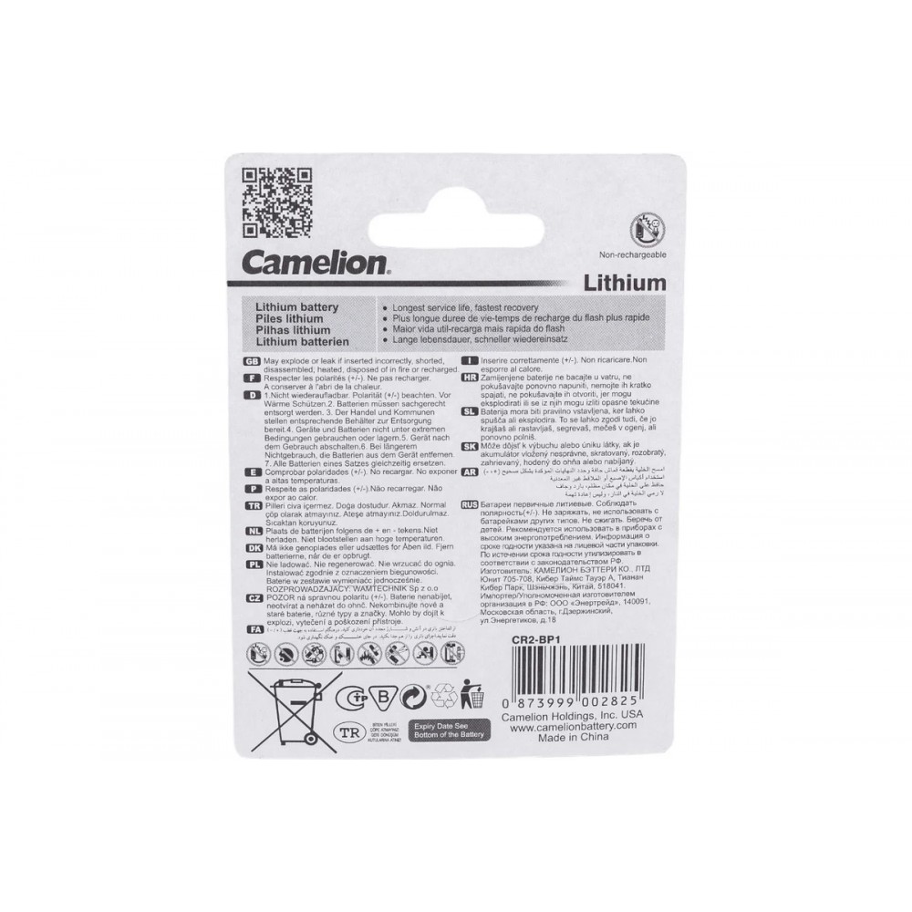 Фотобатарейка Camelion CR2 BL-1 предназначена специально для цифровых камер, вспышек, охранных датчиков и другого оборудования, работающего от малогабаритных аккумуляторов высокого качества.