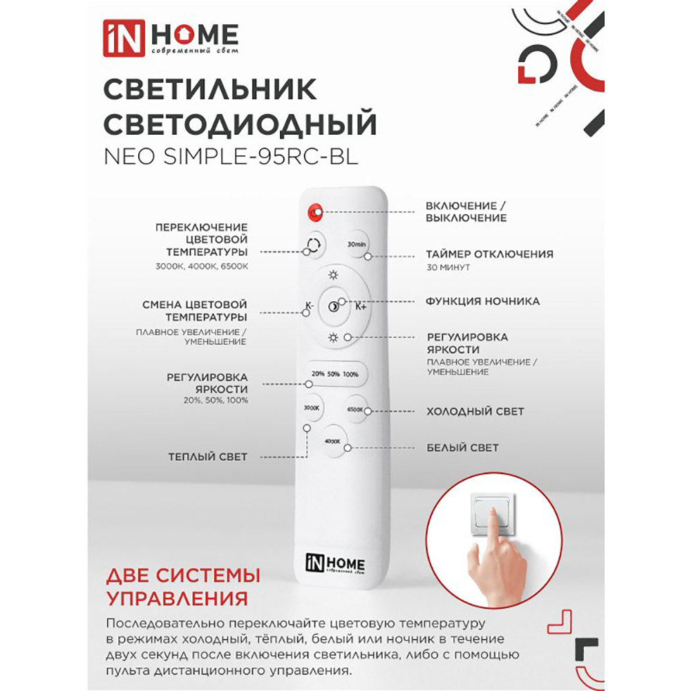 Две системы управления позволяют последовательно переключать цветовую температуру в режимах холодный, теплый, белый или ночник с помощью настенного выключателя или воспользоваться пультом дистанционного управления (ДУ) с широким набором функций.