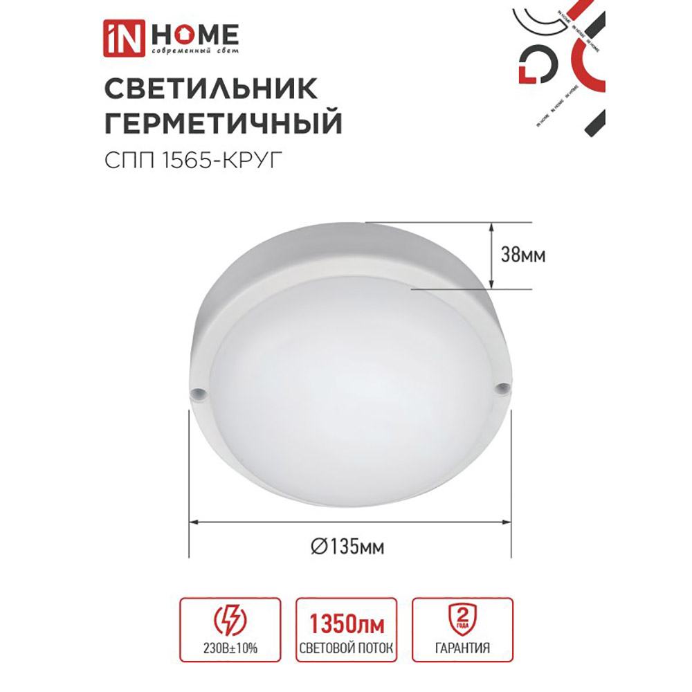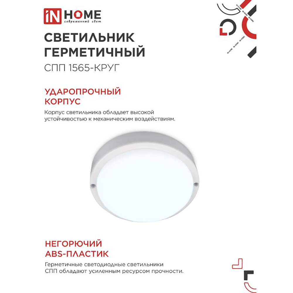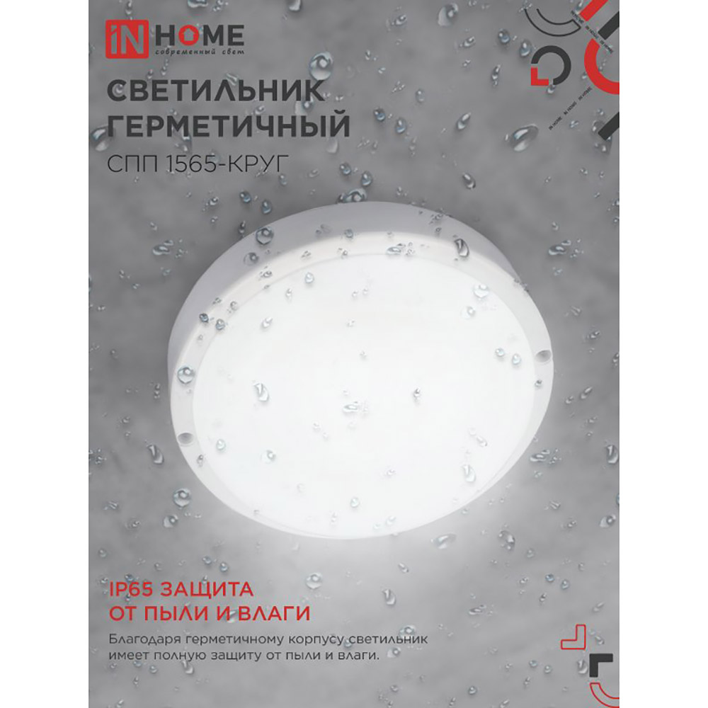Светильник влагозащищённый светодиодный 15Вт, 220В, 6500К, круглый, Белый СПП 1565-КРУГ IN HOME