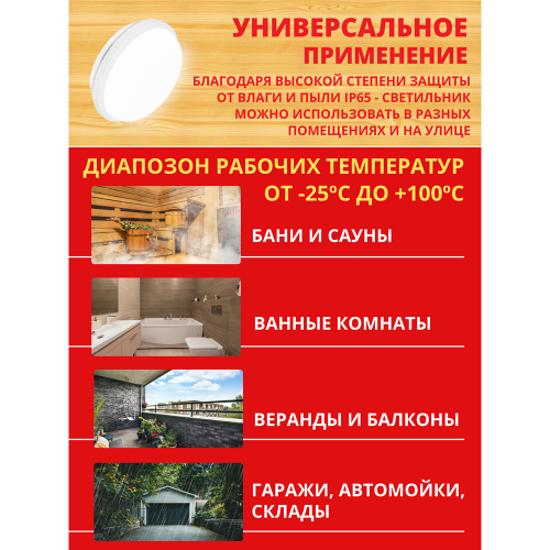 Представляем светодиодный светильник мощностью 15Вт, идеально подходящий для установки в банях, саунах, ванных комнатах и душевых. Этот круглый потолочный светильник обладает высокой прочностью и обеспечивает надежную защиту от влаги и пыли благодаря герметичному корпусу, что делает его идеальным выбором для влажных помещений и уличных зон.
