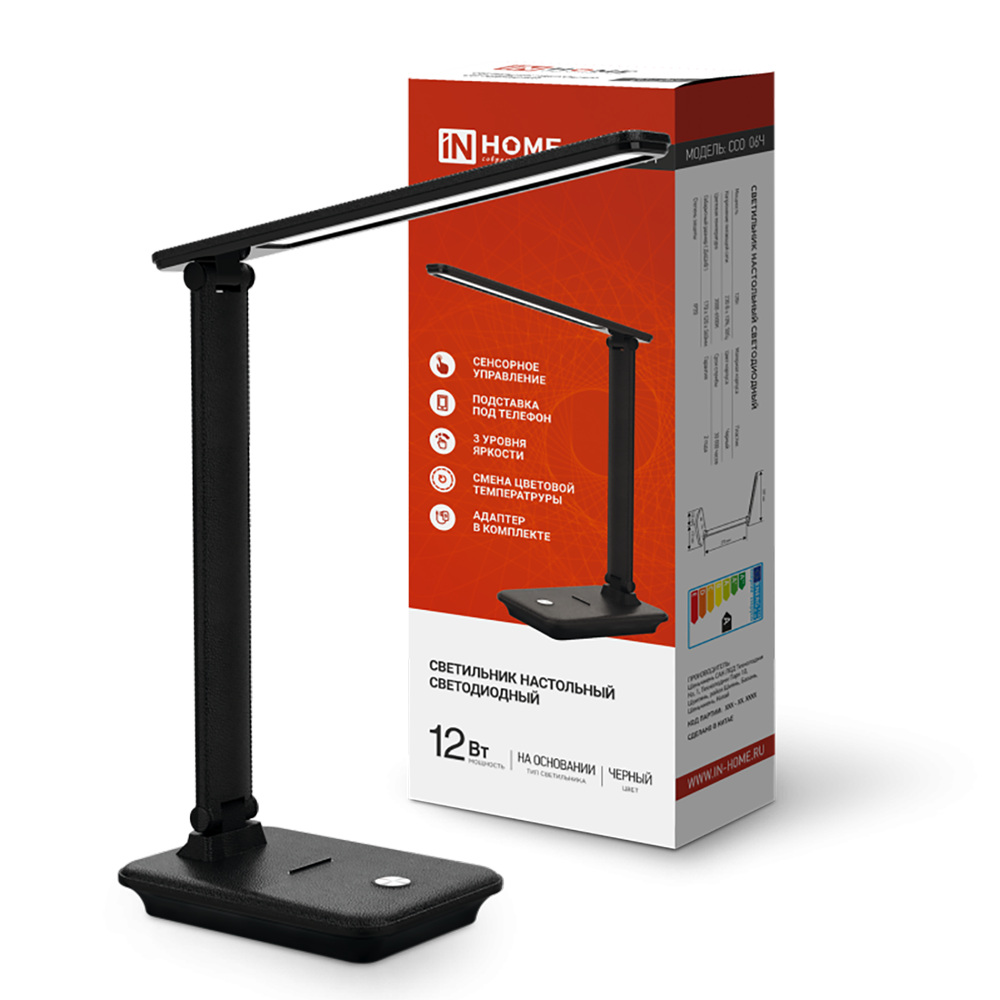 Настольный сенсорный светильник ССО 06 ТМ IN HOME со встроенными светодиодами формирует равномерный световой поток. Текстура корпуса имитирует кожу. Конструкция прибора позволяет регулировать высоту и угол наклона, а также фиксировать настольную лампу в нужном положении. Сочетание специального рассеивателя из современных материалов и оптимальной цветовой температуры помогает исключить блики и снизить нагрузку на глаза. Изменение яркости свечения (3 уровня диммирования) осуществляется через расположенный на подставке сенсорный переключатель. Там же находится подставка для мобильного телефона. Модель дополнительно комплектуется шнуром 1,4м с адаптером 12V (1,5А).