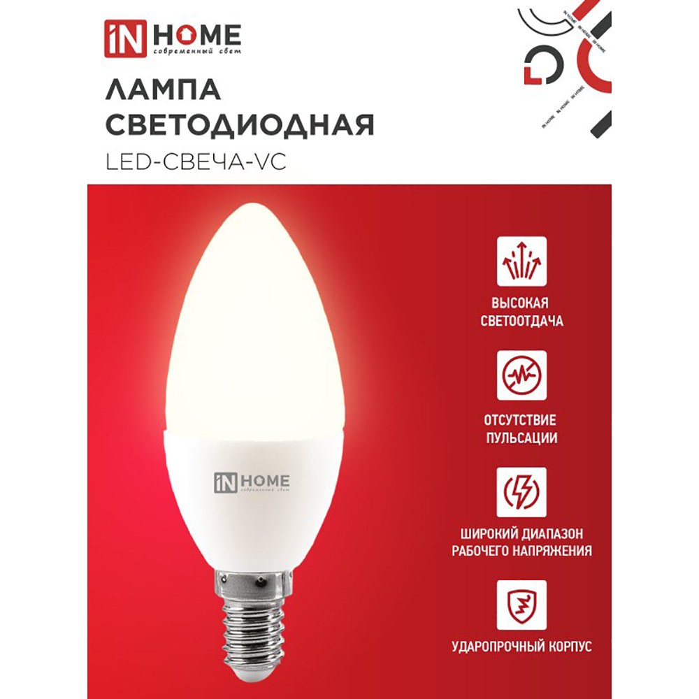 Лампа светодиодная LED-СВЕЧА-VC от IN HOME — это идеальное сочетание качества и стиля. Благодаря уникальной технологии VISION CARE, эта лампа обеспечивает комфортное освещение без вредных пульсаций, защищая глаза от усталости и раздражения. Изящная форма лампы-свечи добавляет интерьеру романтики и индивидуальности. Кроме того, светодиодная лампа очень экономична, позволяя снизить расходы на электроэнергию до 90%. Светодиодные лампы LED-СВЕЧА-VC с матовым рассеивателем - современное и экономичное решение для элегантных люстр, бра и других светильников.
