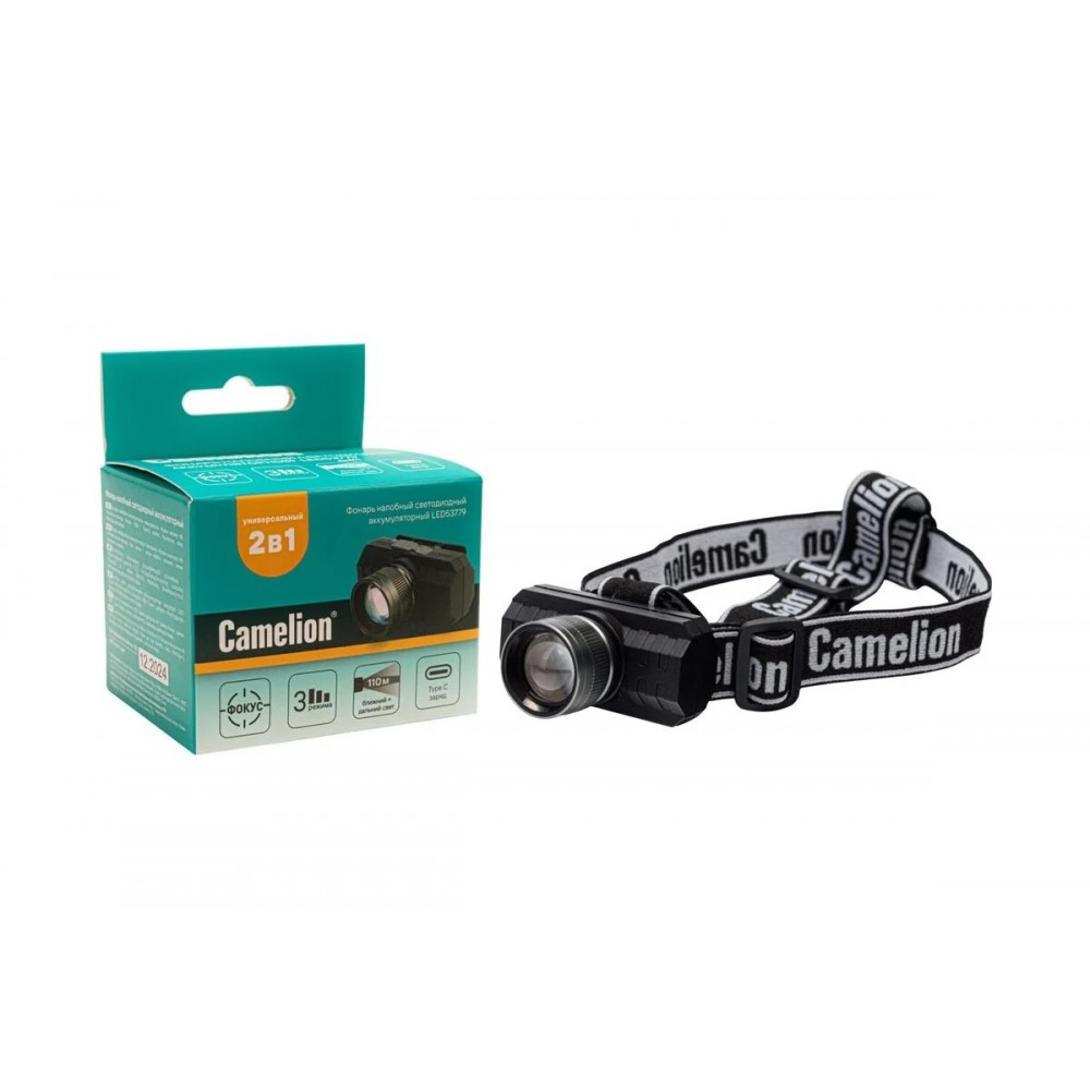 Фонарь светодиодный аккумуляторный налобный Черный 3Вт, 3,7В, XPE, ZOOM, 3 режима, Type-C, бокс LED53779 Camelion