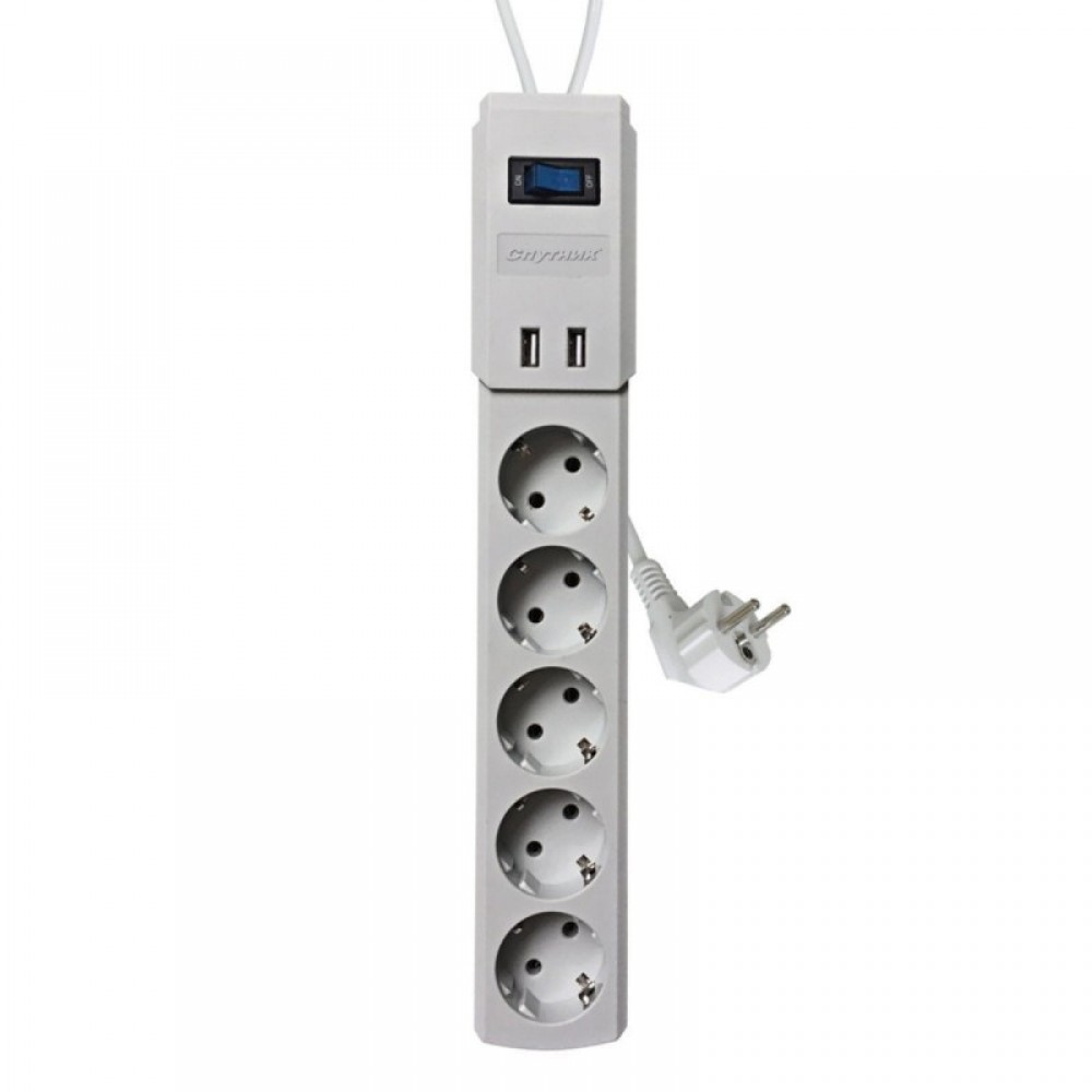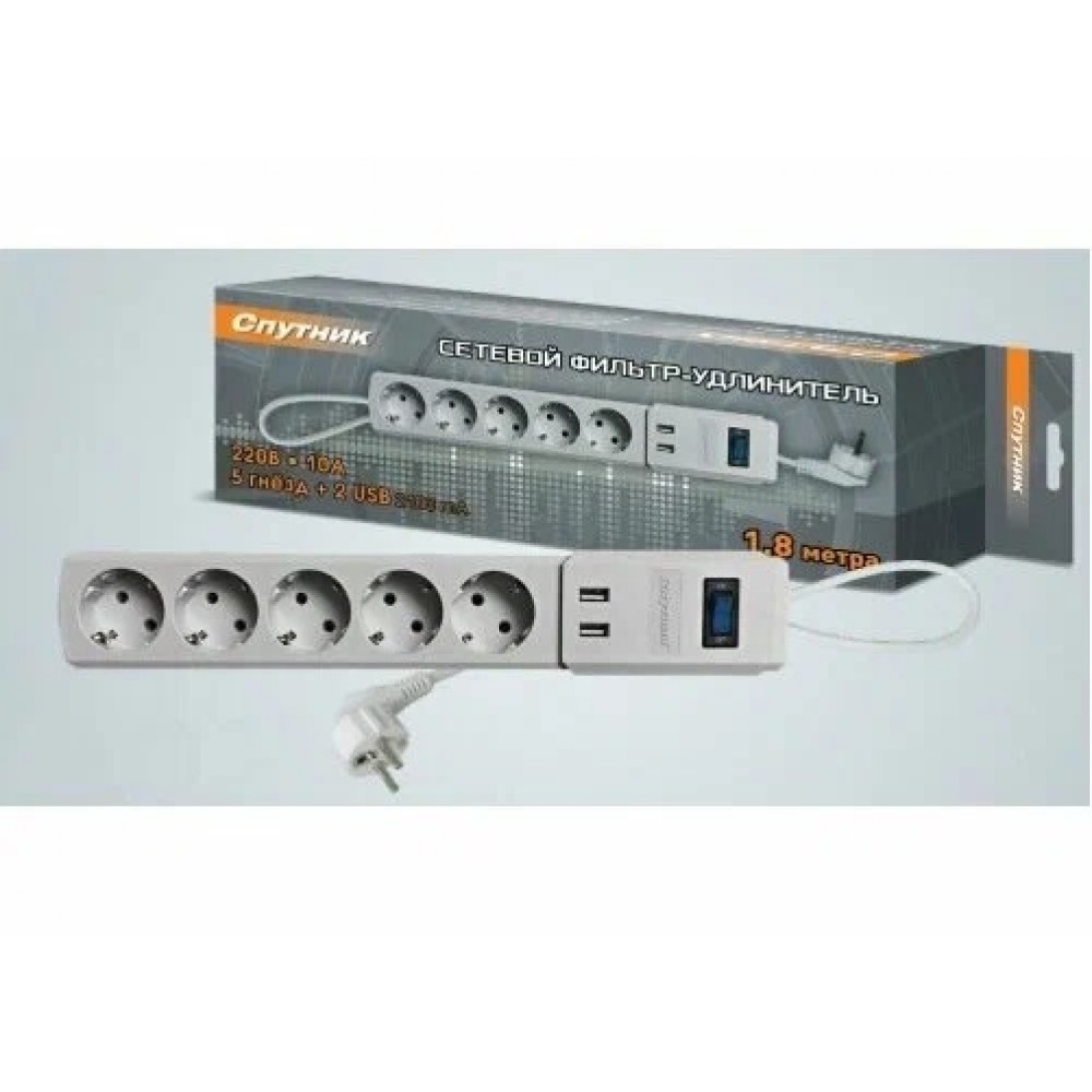 Фильтр сетевой 5 гнезд с заземлением, длина 1,8 метра, 10А, 2xUSB, белый, SP-518USB Спутник