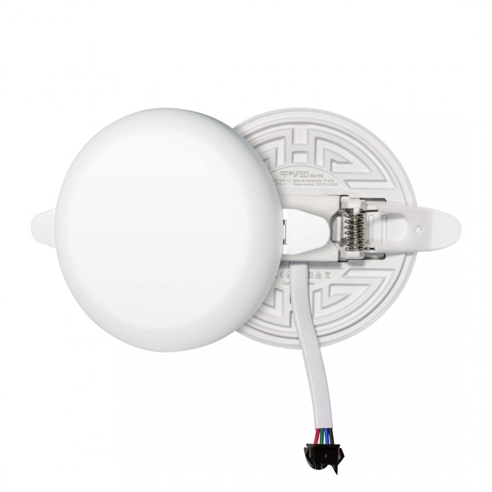 Светодиодная встраиваемая безрамочная панель 06-100 излучает световой поток в 770 Лм, потребляя при этом 9 Вт (6Вт+3Вт), что в итоге дает энергоэффективность 85 Лм/Вт. Особенностью данного изделия является 3-х ступенчатая регулировка уровня освещенности путем нажатия клавиши выключателя: 1) освещение всей поверхности плафона, угол рассеивания 180°; 2) концентрированное освещение внутреннего диаметра, угол рассеивания 120°; 3) засветка торцевой части панели, эффект «кольцевого освещения». Вторая особенность панели – регулировка крепежных зажимов под посадочное отверстие Ø55-75 мм. Третья особенность – безрамочный дизайн плафона, благодаря чему возможна повышенная освещенность с углом рассеивания 180°.