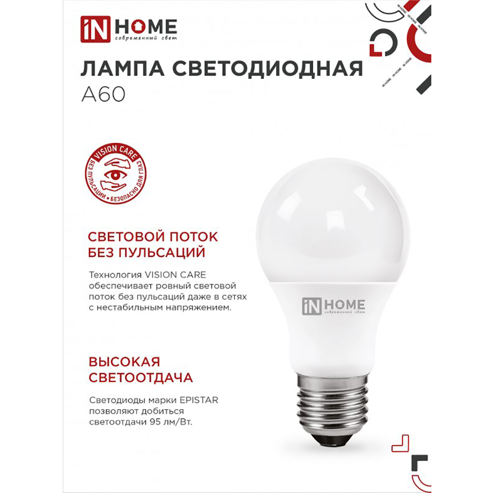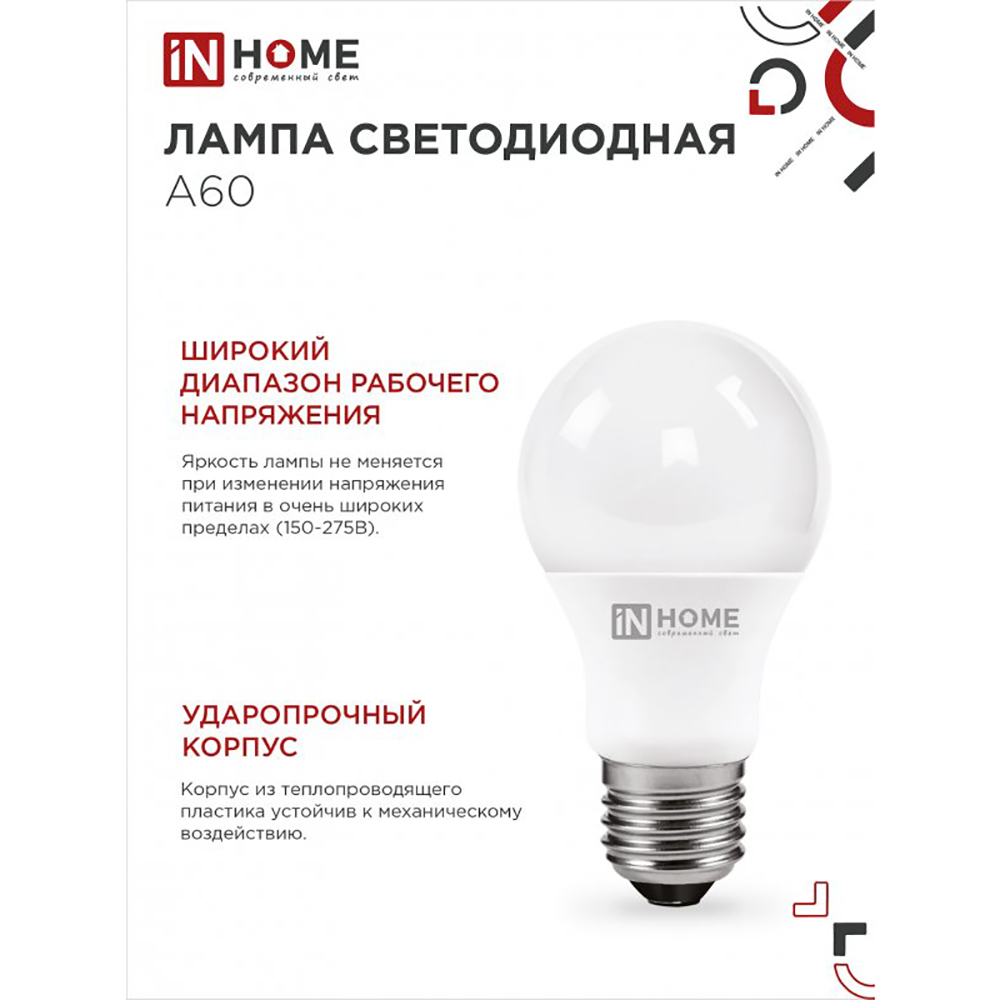 Технические характеристики Лампа светодиодная груша 10Вт, A60, E27, 4000K, 230В IN HOME