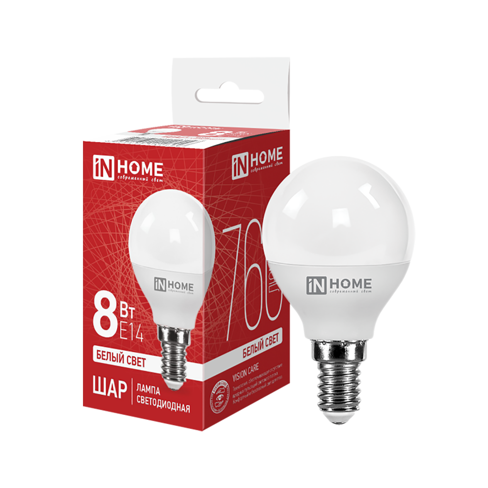 Лампа светодиодная шар 8Вт, G45, E14, 4000K, 220В In Home