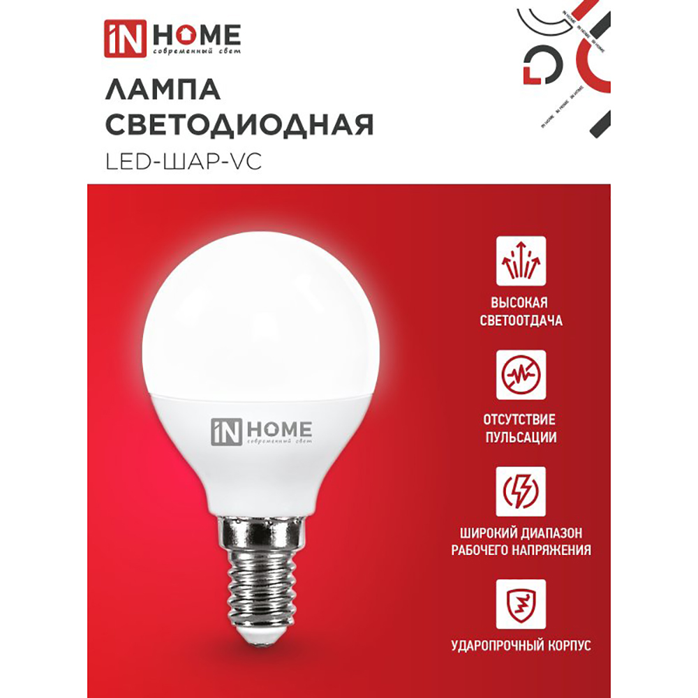 Лампа светодиодная LED-ШАР-VC от IN Home - это энергоэффективное и долговечное решение для освещения вашего дома. Она имеет мощность 8 Вт, цветовую температуру 6500 К и световой поток 720 лм. Лампа подходит для большинства люстр и светильников с цоколем E14.