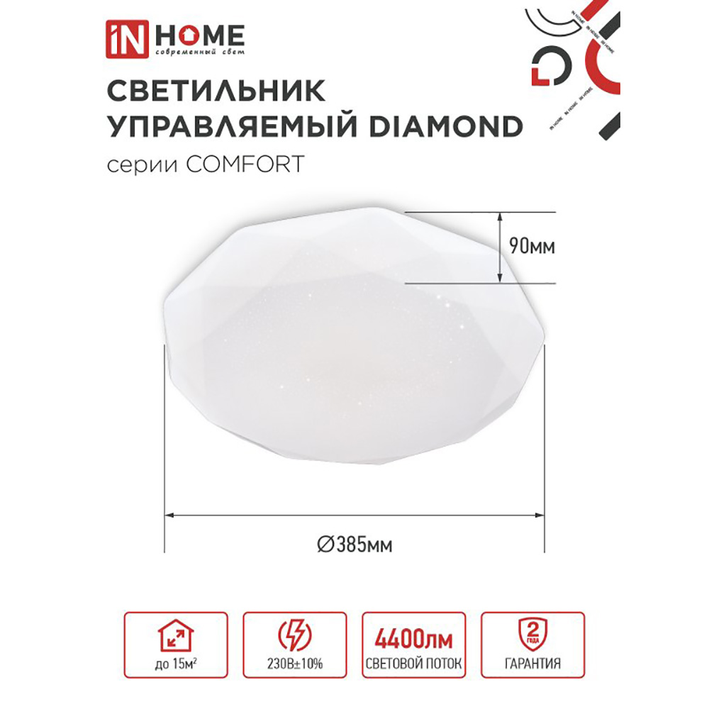 Светодиодный светильник DIAMOND с современной системой управления и оригинальным корпусом в форме ограненного бриллианта станет удачной заменой классической потолочной люстры. Пульт дистанционного управления позволяет изменять цветовую температуру от уютного теплого (3000К) до холодного белого света (6500K) или приглушить яркость освещения до режима ночника (5% освещенности).