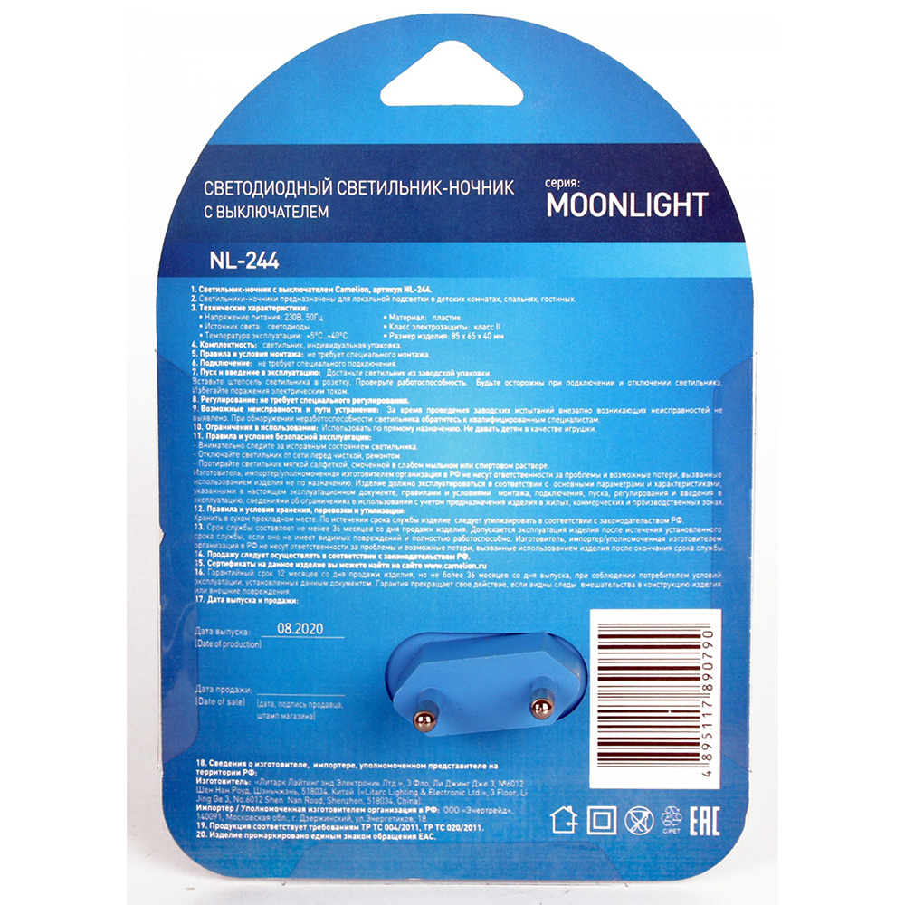Светильник ночник предназначен для локальной подсветки в детских комнатах, спальнях, гостиных. Camelion NL-244 "Месяц", питание от сети 220В, размеры , источник света - встроенные светодиоды, выключатель на корпусе, пластик