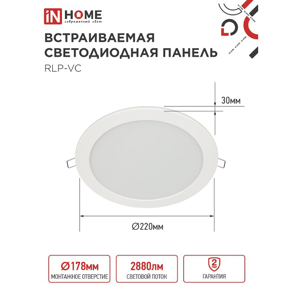 Технические характеристики Панель светодиодная встраиваемая круглая RLP-VC 36Вт 230В 6500К 2880Лм 220мм белая IP40 IN HOME