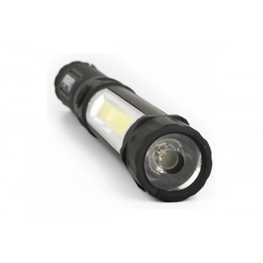 Фонарь светодиодный комбинированный (дальний + ближний свет) - для мелких работ в затемненных условиях. Цвет корпуса: матовый черный с каучуковым напылением. Работает от батареек 3 X ААA (не входят в комплект). Материал корпуса - пластик. Источники света - 1 точечный светодиод мощностью 1 Ватт со световым потоком 45 люмен (для дальнего света) с фокусировкой коллиматорной линзой; COB - светодиод (технология Chip - on - Board, светится не одна точка, а вся желтая поверхность) для ближнего света мощностью 1 ватт со световым потоком 45 люмен - в боковом плафоне. Дистанция освещения: дальний свет - до 30 м., ближний - до 7 м. Два режима работы. Выключатель - кнопочного типа (с защитной резиновой накладкой) на корпусе фонаря. Время работы - до 8 часов в обоих режимах.