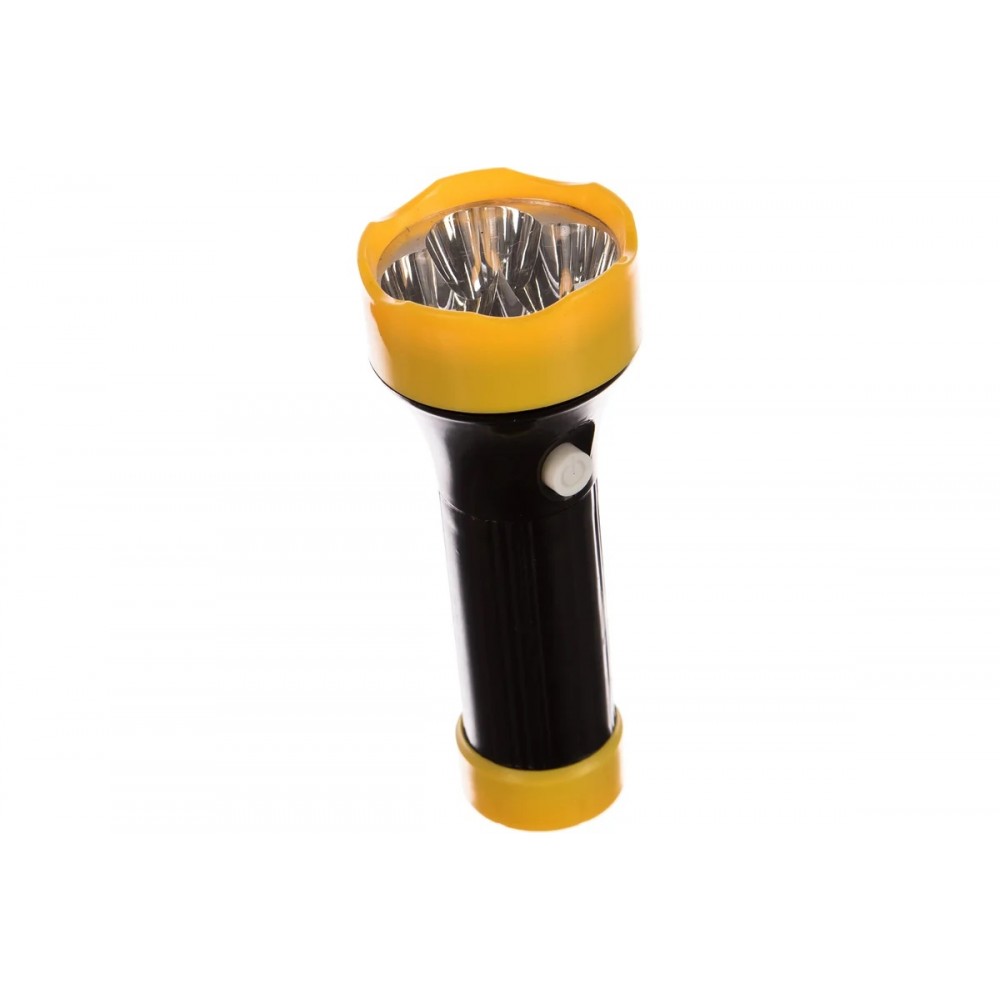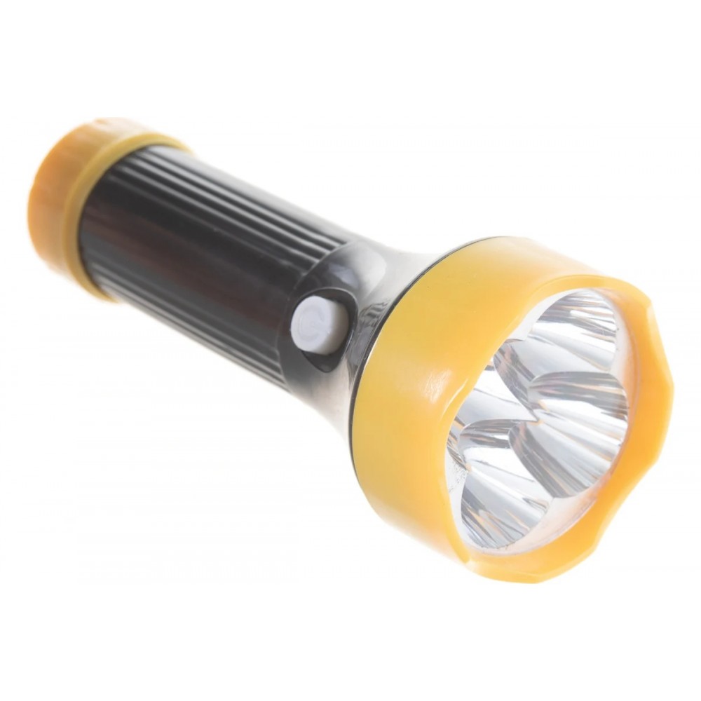 Фонарь Ultraflash электрический светодиодный. Цвет корпуса: желтый + чёрный. Работает от 3 X AAA батареек (не входят в комплект). Материал корпуса - пластик. Источник света - 4 светодиода с рассеивающими линзами с цветовой температурой 8000К с осевой силой света одного светодиода - 1200 милликанделл, суммарный световой поток 20 люмен. Дистанция освещения - до 15 метров. Один режим работы. Выключатель - кнопочного типа.