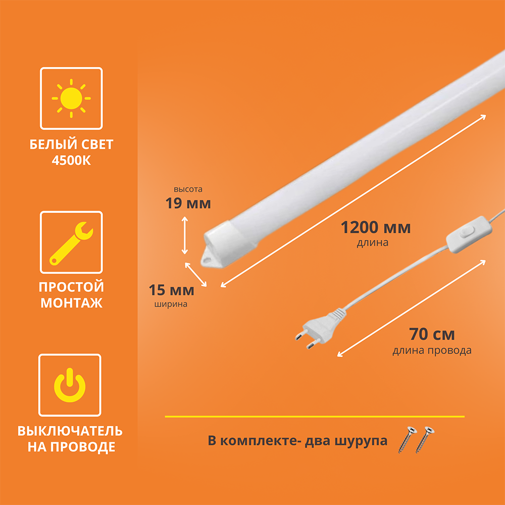 Технические характеристики Светильник линейный светодиодный 18Вт, 220В, 4500К, с сетевым проводом и выключателем на проводе LWL-2022-02 ULTRAFLASH