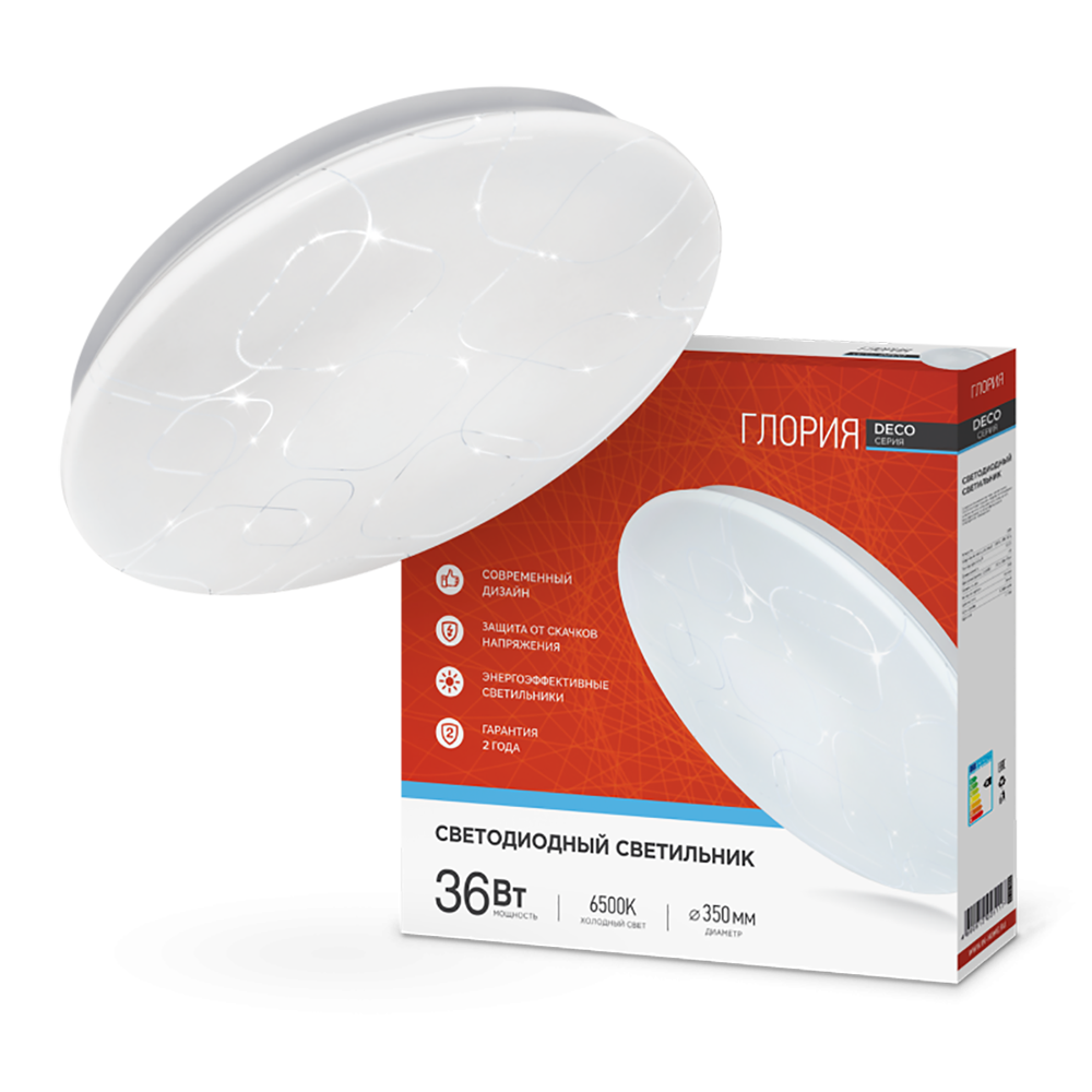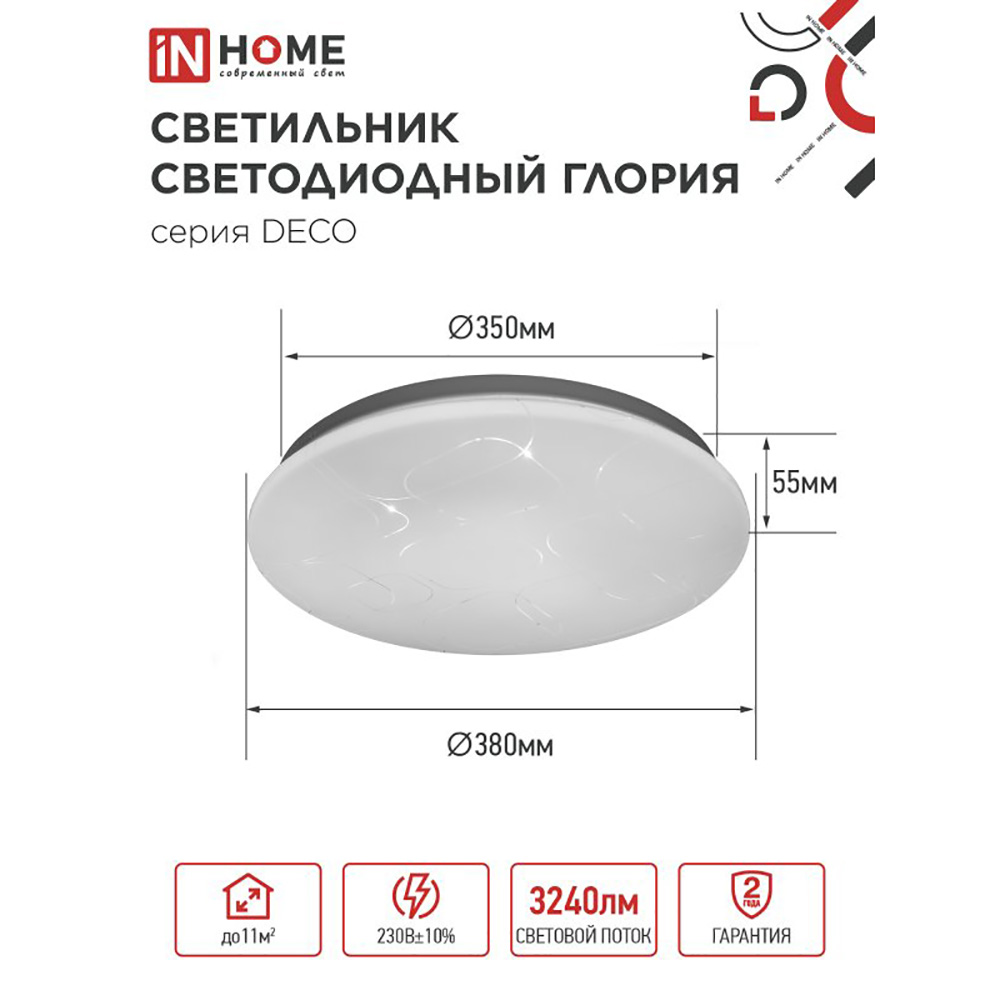 Технические характеристики Светильник настенно-потолочный светодиодный 36Вт, 6500K, 350x55мм, IP20 "ГЛОРИЯ" IN HOME