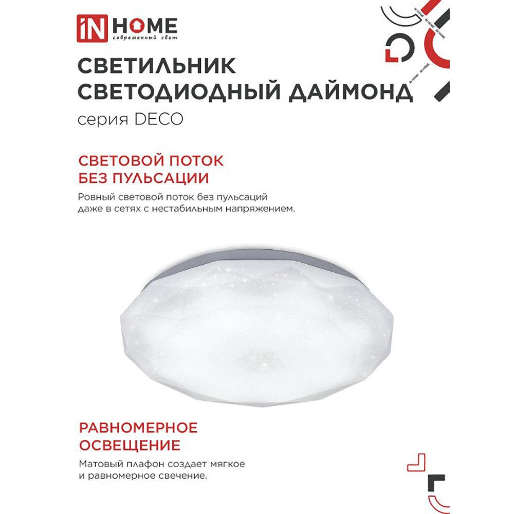 Светодиодный накладной светильник ДАЙМОНД серии DECO In Home выполнен в оригинальной форме ограненного бриллианта. Светодиодные светильники ДАЙМОНД серии DECO предназначены для внутреннего освещения жилых помещений, подъездов и сферы ЖКХ, офисных и административных учреждений, магазинов, а также холлов, коридоров, лестничных пролётов, подсобок и других помещений вспомогательного назначения. Современные светильники серии DECO, работающие на основе последнего поколения светодиодов, обеспечивают яркий равномерный световой поток при максимальной экономии электроэнергии. Отсутствие пульсации гарантирует сохранность здоровья глаз. Светодиодные светильники являются одним из самых экологически безвредных источников света и не требуют специальной утилизации и переработки. Линейка светильников представлена в нескольких размерах и вариантах мощностей (от 12 Вт до 48 Вт), что позволяет подобрать оптимальный осветительный прибор в зависимости от конфигурации и габаритов помещения.