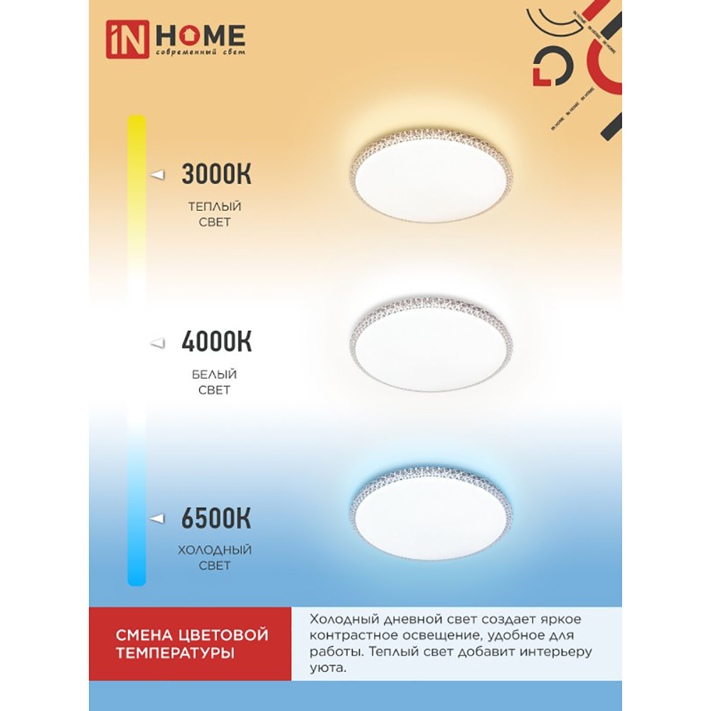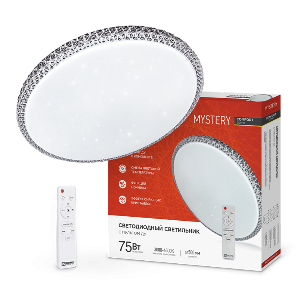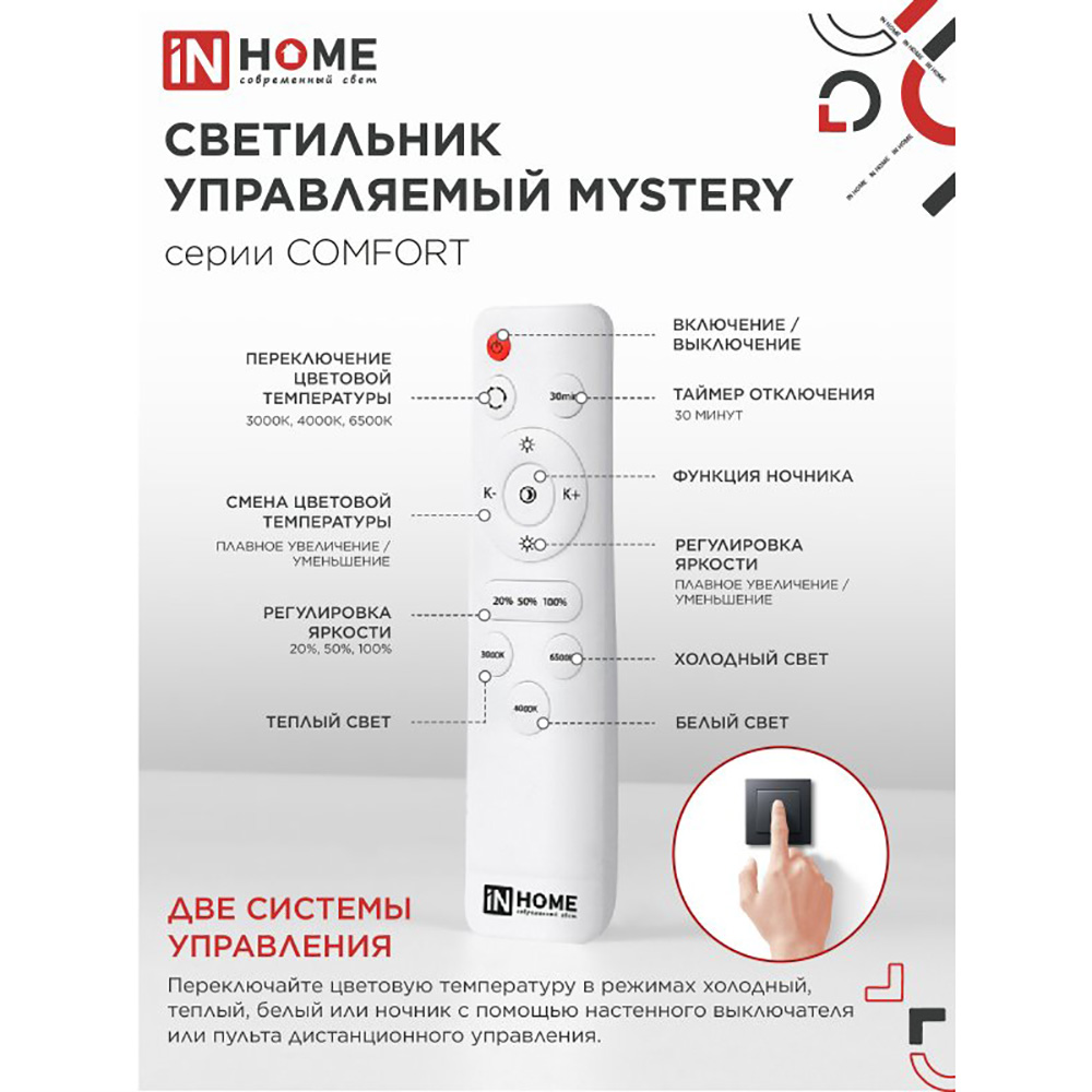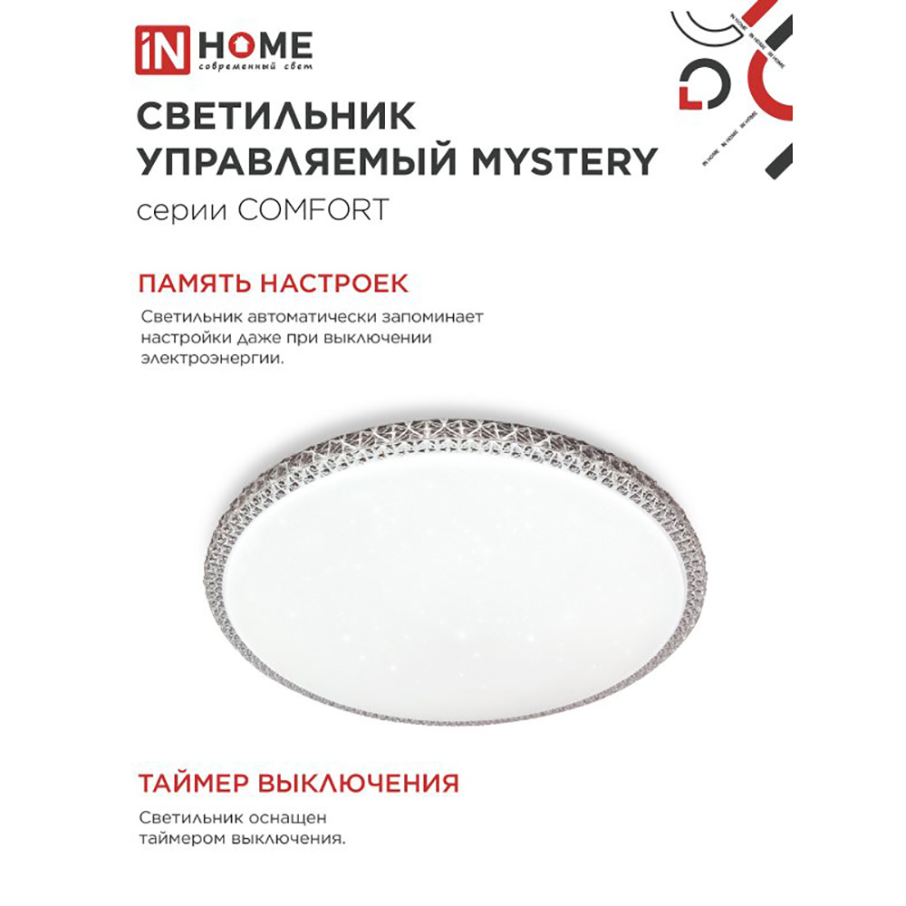 Светодиодный светильник MYSTERY от ТМ INhome в ореоле ограненного «хрусталя» создаст впечатляющий эффект «звездного неба» даже в самом простом помещении, а современная система дистанционного управления повысит уровень домашнего комфорта. Ведь благодаря входящему в комплект пульту, вы сможете регулировать освещение, не вставая с дивана. Красивый, удобный и экономичный светильник излучает равномерный, комфортный для глаз свет, без пульсаций. Пульт дистанционного управления позволяет изменять цветовую температуру от уютного теплого до холодного белого света или приглушить яркость освещения до режима ночника. Холодный дневной свет (6500К) создает яркое контрастное освещение, удобное для работы с мелкими предметами и деталями. Теплый свет 3000К придаст интерьеру уюта и будет способствовать расслаблению в период вечернего отдыха. Умный светильник оснащен специальным таймером выключения на 30 минут и 1 час. Степень защиты IP20 оберегает внутреннее устройство светильника от частиц пыли. Осветительный прибор имеет вст