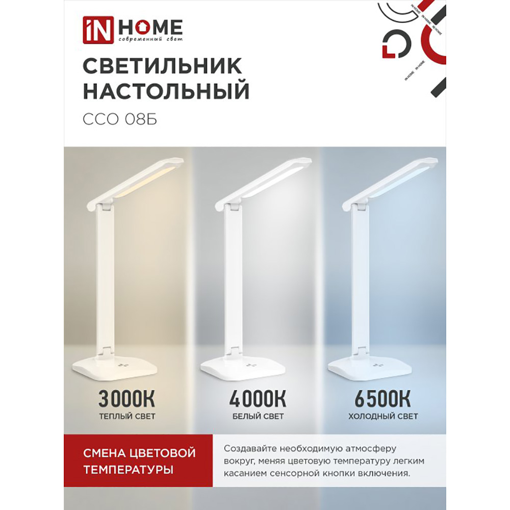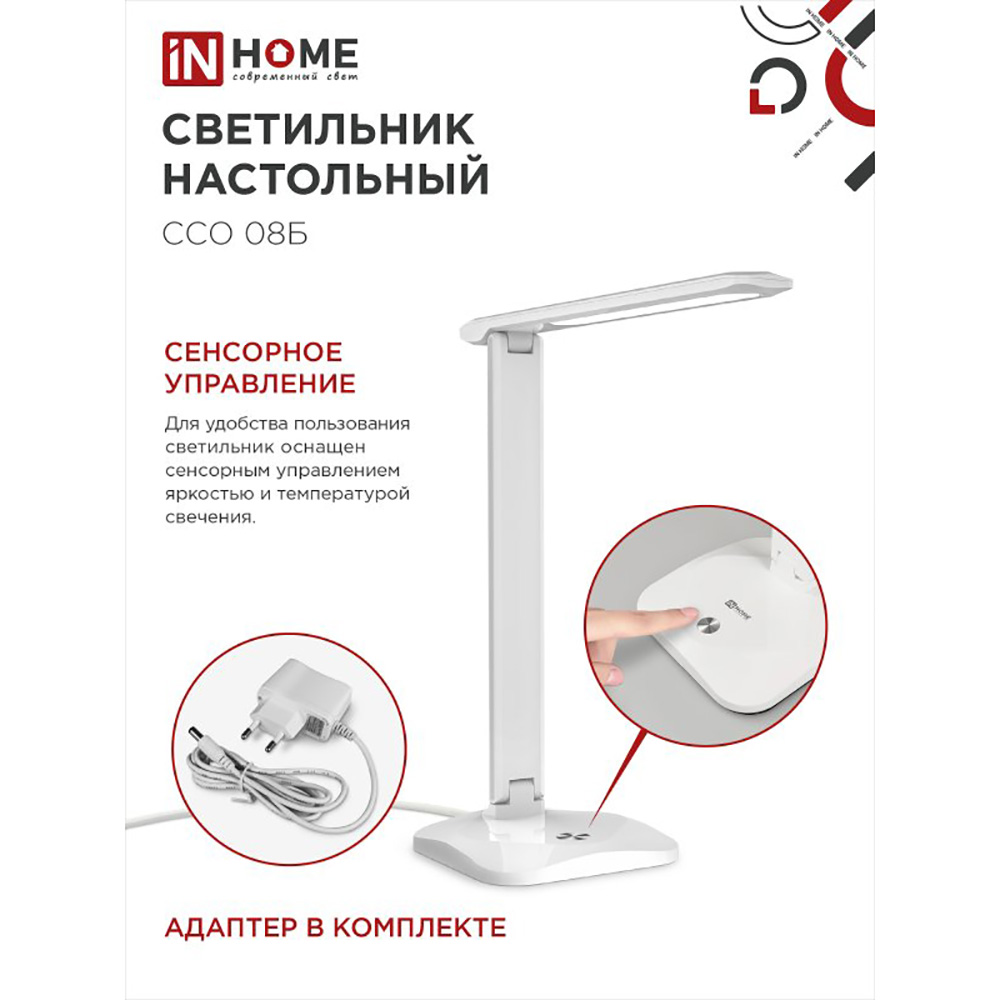 Светильник настольный светодиодный на подставке ССО 08Б 12Вт, 3000-6500К, 600лм, сенсор-диммер, с адаптером, белый IN HOME