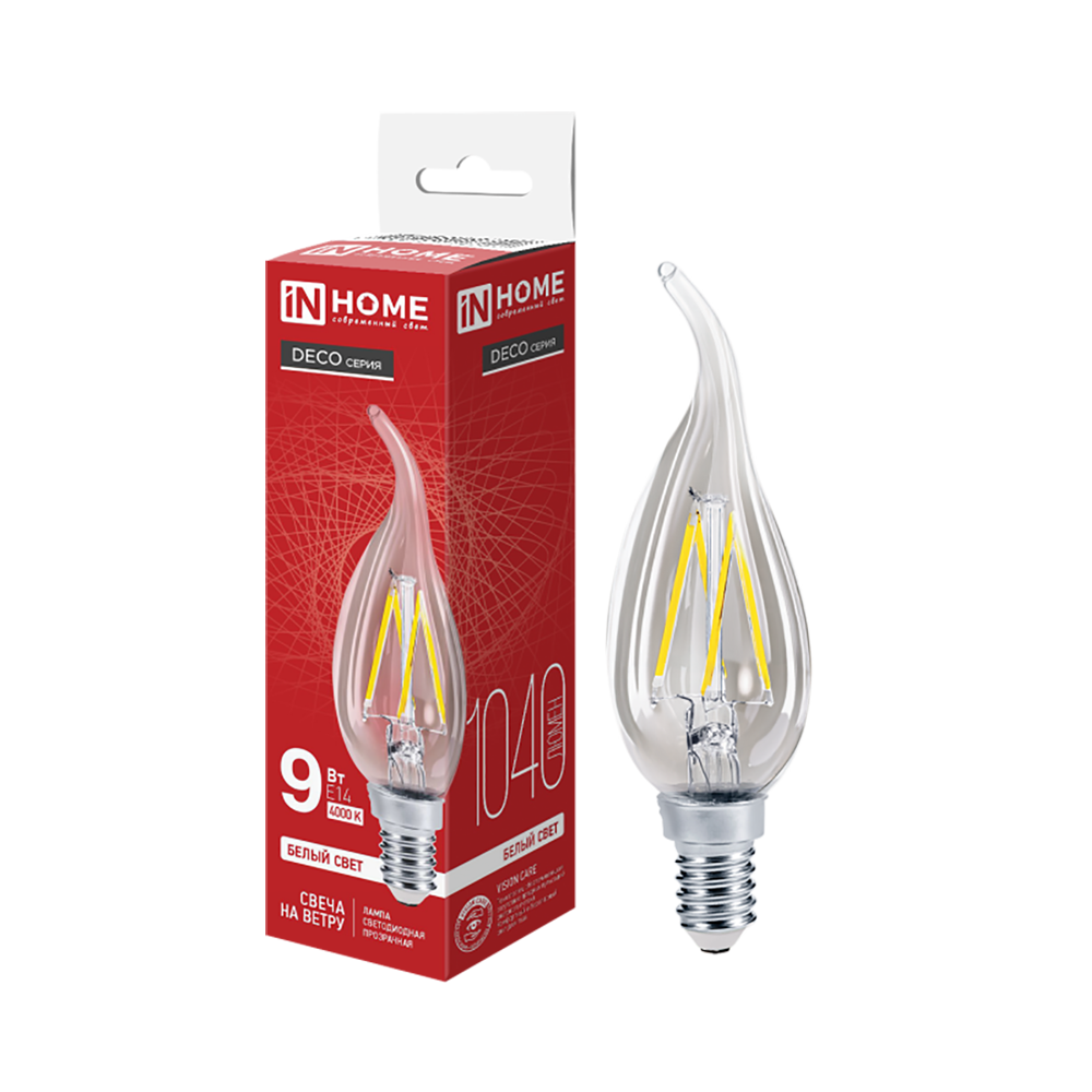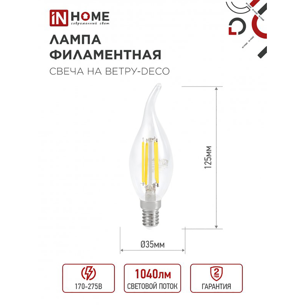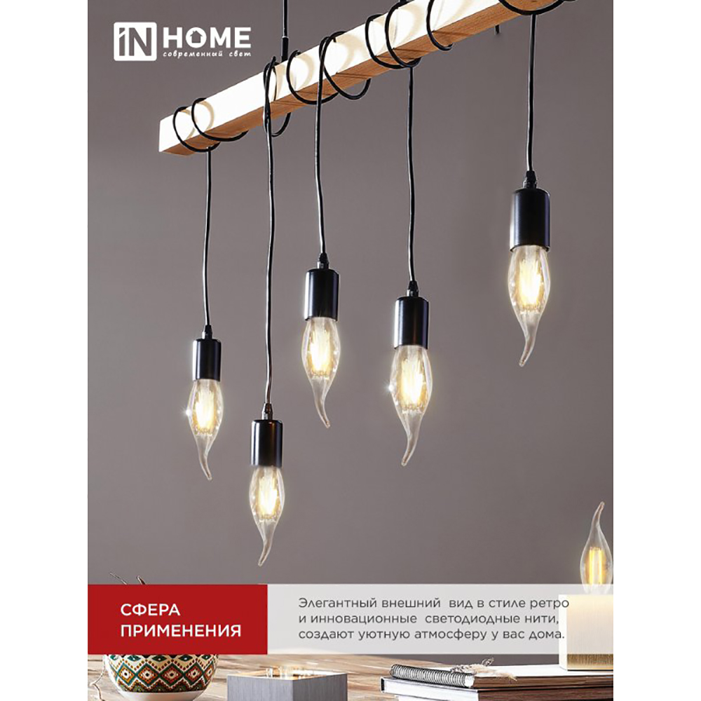 Изящная лампа от ТМ IN-HOME LED-СВЕЧА НА ВЕТРУ-deco с инновационной филаментной нитью в качестве источника света применяется для основного и декоративного освещения в жилых и общественных помещениях. Высокая экономичность светодиодной лампы позволяет сокращать энергопотребление до 90% (по сравнению с лампами накаливания). Помимо особой декоративности дизайна, модель включает в себя все преимущества светодиодных ламп: высокий класс энергоэффективности, малая теплоотдача, яркий световой поток, равномерное свечение с безопасным коэффициентом пульсации, срок службы 30 000 часов.