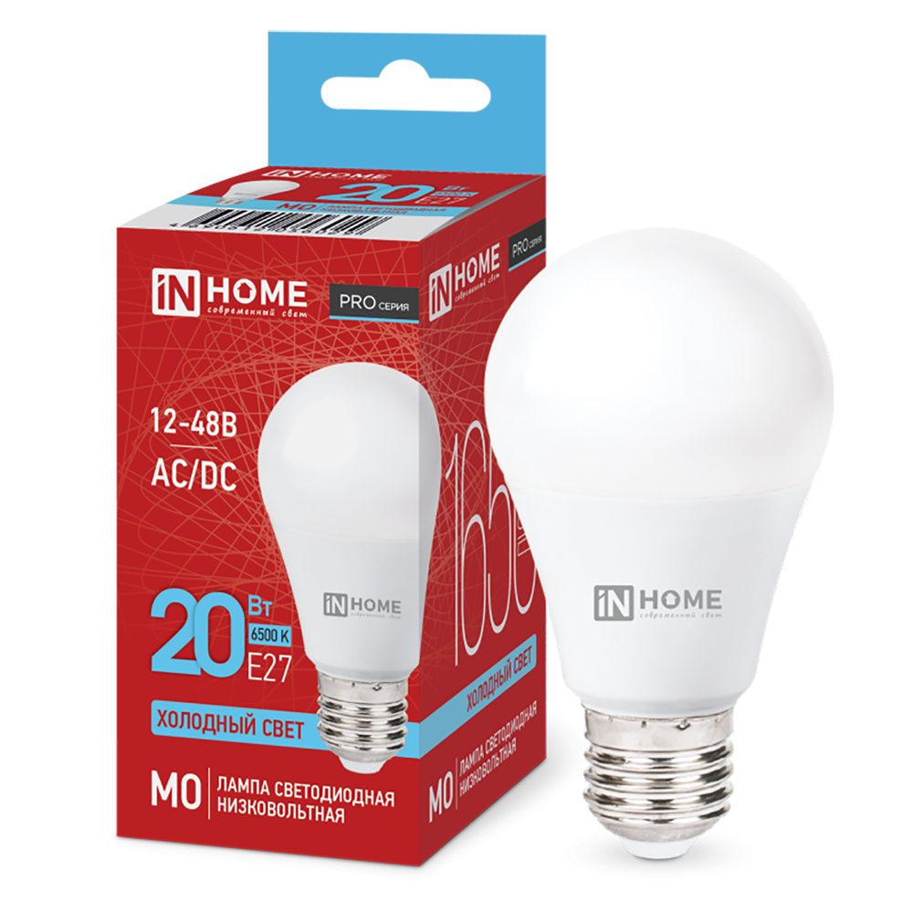 Лампа светодиодная низковольтная LED-MO-PRO 20Вт 12-48В Е27 6500К 1650Лм от IN Home — это надежное и эффективное решение для освещения. Она идеально подходит для использования в низковольтных светильниках постоянного тока и обеспечивает яркий свет с цветовой температурой 6500 К.